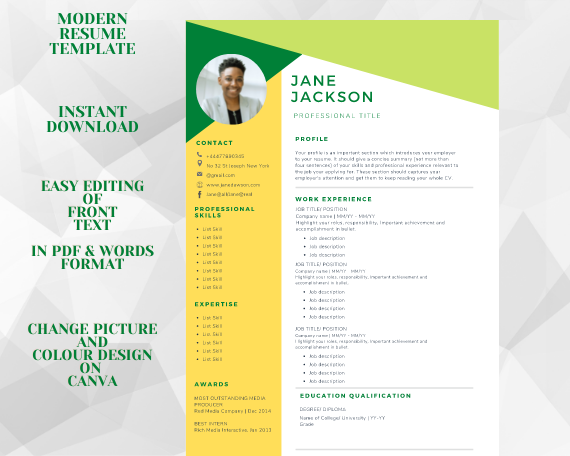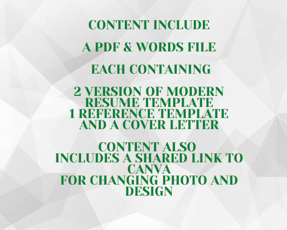 You'll get a PDF, WORDS File and a link to Canva of Modern Professional Resume/CV Template with Profile Picture and Cover Letter.